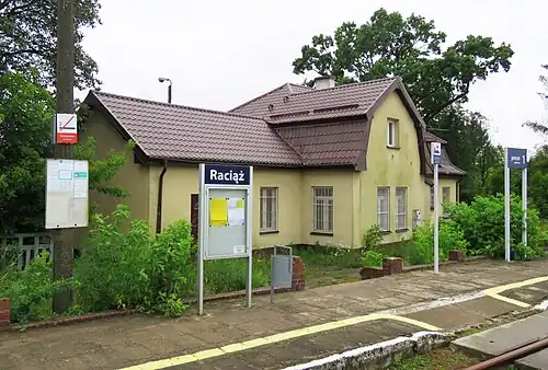 Raciąż railway station is a railway station in Raciąż, Płońsk, Masovian, Poland. It is served by Koleje Mazowieckie.