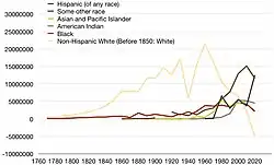 | Hispanic (of any race) | 2,021,820[27] | 3,231,409[27] | 5,814,784[27] | 8,920,940[27] | 14,608,673 | 22,354,059 | 35,305,818 | 50,477,594 | 62,080,044 | |