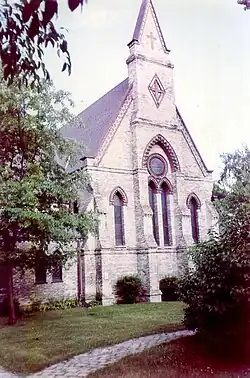 Most of Park Hall was destroyed by fire on January 15, 1864, and almost all of the sizable library of former president Roswell Park was lost. Thanks to donations by the people of Racine, a replacement building was constructed within the year. The college was also able to begin construction on a third building, St. John's Chapel, within the same year. Two years later, Emeline Taylor, the widow of former Racine College trustee Isaac Taylor, died and bequeathed $65,000 to the institution. This sum allowed for the construction of the campus' fourth and largest building, which was named Taylor Hall.[7] The building would later be equipped with a bell tower at the cost of nearly $2,000.[6]