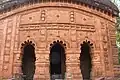 The Radha-Vinoda Temple in Bishnupur, located in the Khar Bangla area, is one of the two at-chala style temples in the region. Despite significant damage to the upper roof and entrance wall, the temple remains an important architectural and historical site.[3] This temple is particularly notable for its intricate design and its unique at-chala construction, where the roof consists of eight sections. However, due to a narrow break between the upper and lower roof sections, the temple gives the impression of a char-chala structure, which typically features four sloping roofs. Facing east, the temple stands on a nearly square plinth measuring approximately 6.4 meters in length and 6.2 meters in breadth. The overall height of the temple is about 10.7 meters. Despite the collapse of some parts of the structure, the temple's rich decorative elements would have originally showcased the craftsmanship of the time. The temple's construction reflects the cultural influence of Vaishnavism and the patronage of local rulers like Raghunatha Singha during the 17th century.[1]
