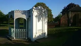 By the end of the 19th century, Radnor House was becoming dilapidated. Purchased in 1902 by Twickenham Urban District along with the adjacent properties, in 1903 the gardens were opened to the public and remain today as Radnor Gardens. The house stood empty for some time and was briefly used as a school clinic. The council's reluctant deliberations on renovation of the house were resolved by its total destruction by a 250kg delayed action high explosive bomb which fell through the house at 10.30pm on 16 September 1940. Only a few walls remain, indicated by commemorative stones, as do the Grade II listed gazebo and summer house.[6][7][8]