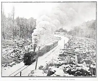 A combination of political pressure and the economic potential of the forestry in the Raetihi area motivated the construction of this line. A start on a tramway from Raetihi to Rangataua seems to have been made in 1908, with some of the route cleared and rails put in place.[2] In 1911, the government granted approval to construct the line, with the line intended to diverge from the North Island Main Trunk in Rangataua. A proposal to electrify the line was investigated by the government's electrical engineer in 1911.[3] The Minister of Public Works (R. McKenzie)[4] turned the first sod, beside the railway at Ohakune,[5] on Monday, 19 February 1912, when 20 workers were about to start building the line.[6] However, due to budget constraints construction did not commence until late in 1913, when the site of the junction was changed to Ohakune.[7][8] The change required redesign of the 2 mi (3.2 km) closest to the North Island Main Trunk.[9] The outbreak of World War I a year later caused delays in both supplies and finding available manpower; nonetheless, work progressed steadily through the war years, and the line was opened on 18 December 1917.[1] Despite proclamations that it was the start of a new route to Whanganui, the line was never extended beyond Raetihi.[10]
