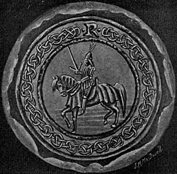 Ragnall is the only member of the meic Somairle known to have styled himself in documents rex insularum.[64][note 7] His use of both the title and seal are probably derived from those of the leading members of the Crovan dynasty, such as his namesake Rǫgnvaldr, who not only bore the same title but was said to have borne a similar two-sided seal.[65] The descriptions of the cousins' seals shows that these devices combined the imagery of a Norse-Gaelic galley and an Anglo-French knight. The maritime imagery probably symbolised the power of a ruler of an island-kingdom, and the equestrian imagery appears to have symbolised feudal society, in which the cult of knighthood had reached its peak in the twelfth and early thirteenth centuries.[66] The use of such seals by leading Norse-Gaelic lords, seated on the periphery of the kingdoms of Scotland and England, probably illustrates their desire to present themselves as up-to-date and modern to their contemporaries in Anglo-French society.[67]