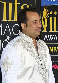 Rahat Fateh Ali Khan (Punjabi: راحت فتح علی خان, Punjabi pronunciation: [ɾɑːɦət̪ fəte(ɦ) əliː xɑːn]; born 9 December 1974)[1] is a Pakistani Punjabi singer, primarily of Qawwali, a form of Sufi devotional music. Khan is one of the most popular and highest paid singers in Pakistan.[3][4] He is the nephew of Nusrat Fateh Ali Khan, son of Farrukh Fateh Ali Khan and grandson of Qawwali singer Fateh Ali Khan[5] In addition to Qawwali, he also performs ghazals and other light music. He is also well-known as a playback singer in Hindi cinema and the Pakistan film industry.[6]