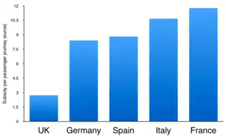 Like roads, the French railways receive rail subsidies from the state in order to operate. Those amounted to €13.2 billion in 2013.[17]