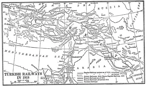 - ^ In the Ottoman Empire: some parts of lines extending into the middle east would not be incorporated into the Turkish State on its creation