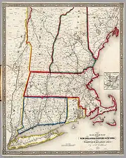 The first railroad in Connecticut was the New York and Stonington Railroad, which was chartered in May 1832 and began construction in 1833.[9] Rhode Island gained its first railroad company the next month in the New York, Providence and Boston Railroad. The two companies merged under the latter name the next year, before either was completed. The combined company ran its first train on November 10, 1837.[10] Railroads first came to New Hampshire via the Nashua and Lowell Railroad, chartered on June 23, 1835, by the state to connect Nashua to the Boston and Lowell.[11]