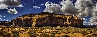 Rain God Mesa is situated 3.5 miles (5.6 km) southeast of the Monument Valley visitor center on Navajo Nation land. Precipitation runoff from this mesa's slopes drains into Gypsum Creek which is a tributary of the San Juan River. Topographic relief is significant as the summit rises 600 feet (183 meters) above the surrounding terrain in one-quarter mile (0.4 km). The nearest higher neighbor is Elephant Butte, 1.4 miles (2.3 km) to the north-northwest.[3] The landform's toponym has been officially adopted by the U.S. Board on Geographic Names.[2] The name refers to Navajo medicine men praying and giving thanks to the Rain God, who provides water. Streaks from water that seeps out at the base of the sandstone can be seen on the south side of the mesa.[4]