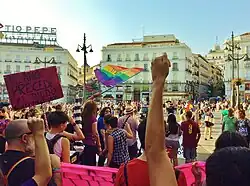 Following the passage of gay marriage in Spain, members of the LGBT community felt the Pride Parade was no longer protest demonstration and instead becoming a tourist business.[44] Since 2006, several demonstrations against LGBT commodification have been held annually in suburbs of Madrid, called Alternative Pride or Critical Pride (Orgullo Alternativo or Orgullo Crítico).[45][46] The first Indignant Pride (Orgullo Indignado) parade was held, calling for a different sexuality regardless of economic performance which should take into account gender, ethnicity, age and social class intersectionalities besides other non-normative corporalities.[47] Later, the event retrieved the name Critical Pride (Orgullo Crítico), based on in part on objections to pink capitalism.[48]