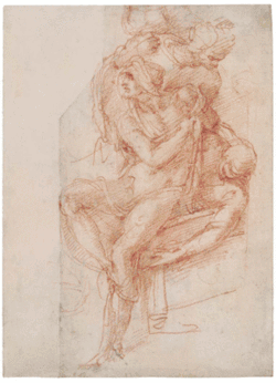 Compositional drawings for the figures of Lazarus and his two attendants were supplied by Michelangelo. In addition to the drawing in the British Museum illustrated here, there are other drawings by Michelangelo there and in Bayonne,[23] all of Lazarus and the two men supporting him, except for one of a foot, perhaps relating to Christ.[24] Modern imaging techniques show that a different figure of Lazarus exists in the underdrawing, which was apparently changed to match one of Michelangelo's drawings (illustrated below) while painting was in progress, perhaps when Michelangelo visited Rome in January 1518.[25] A drawing by Sebastiano seems to contain a sketch for this figure as well as one for the Saint Peter in the painting.[26]
