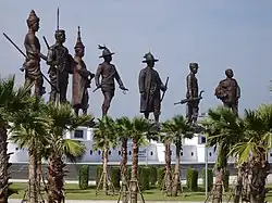 The park consists of three distinct areas. The first, covering an area of five rai (8,000 m2), is dominated by the statues of seven notable Thai kings. They are King Ram Khamhaeng (reigned 1279-1298) of the Sukhothai period, King Naresuan (1590-1605) and King Narai (1656-1688) of the Ayutthaya period, King Taksin (1767-1782) of the Thonburi period, and King Rama I (1782-1809), King Mongkut (1851-1868), and King Chulalongkorn (1868-1910) of the Rattanakosin period. Each statue is made of bronze, with an average height of 13.9 meters. They were designed by Thailand's Fine Arts Department. Casting of the statues and construction of the multi-purpose plaza took 10 months, from November 2014 to August 2015. There are plans to add statues of two additional kings in the future.[3]
