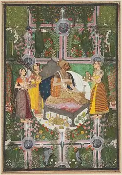 All of this does not change the fact, that a general trend throughout Rajput painting in this period is a growing interest in spatial realization, even if not achieved through linear perspective, consequent on a movement of artists from Delhi to Rajput courts.[77] This is linked with reinvigoration of Mughal painting under the patronage of Muhammad Shah (r. 1719–1748), whose "reign was long enough for a distinctive style to flower".[7] Mughal artists again experimented with light and space and the depiction of buildings in almost perfect perspective is particularly successful.[78] This minor renaissance ended abruptly in 1739 when Nader Shah invaded India and sacked Delhi. After this "all who could flee from Delhi did so"[7] and many painters made their way to Rajput courts. Their new approach to space allowed newer subjects such as group portraiture, durbar scenes, recording of court ceremonial and grand hunts to enter the traditional repertoire of the Rajput studios.[7][77]