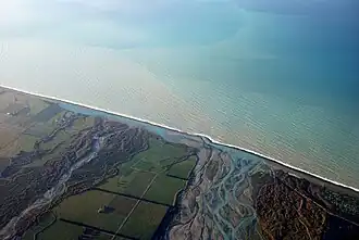 The Rakaia River is in the Canterbury Plains in New Zealand's South Island.[1] The Rakaia River is one of the largest braided rivers in New Zealand.[2] The Rakaia River has a mean flow of 203 cubic metres per second (7,200 cu ft/s) and a mean annual seven-day low flow of 87 m3/s (3,100 cu ft/s).[3] In the 1850s, European settlers named it the Cholmondeley River, but this name lapsed into disuse.[4] The name Rakaia comes from Māori "Ō Rakaia", meaning the place where people were arranged by ranks.[5][6]