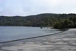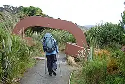 Rakiura National Park covers close to 1,400 square kilometres (540 sq mi),[3] which is about 85% of Stewart Island / Rakiura, New Zealand's third-largest island. The park area excludes the township area around Halfmoon Bay (Oban) and some roads as well as private or Māori-owned land further inland.[1] It is made up of a network of former nature reserves, scenic reserves, and State Forest areas. A chain sculpture at the entrance to Rakiura National Park symbolises the Māori mythology of the island, which held that the South Island was the canoe of the demigod Māui and that Rakiura was the canoe's anchor, as evidenced by an alternative name for the island of "Te Punga o Te Waka a Māui" (the anchor of Māui's canoe).[4] The sculpture was designed by noted Southland sculptor Russell Beck, and was unveiled as part of the opening of the national park.[5][1] In 2008, a similar sculpture was erected in Bluff, and it represents the other end of the chain.[6]