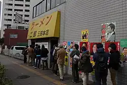 Ramen Jiro has an avid fan base called Jirorian (ジロリアン).[15] According to Noriko Arai, an economics professor at Sophia University, Ramen Jiro employs a "worshipper" type of marketing, relying on a small group of enthusiastic customers, typically students and salarymen.[4] Some Jirorians make a pact to visit all 40 Jiro franchises[3] and regard the first shop in Mita as "the sacred place."