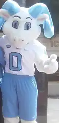 Rameses is the ram mascot of the North Carolina Tar Heels. The anthropomorphic version of him wears a Tar Heels jersey. Two versions of Rameses appear at UNC sporting events. One is a member of the UNC cheerleading team in an anthropomorphic ram costume; the other is a live Dorset Horn sheep named Rameses who attends Carolina football games with his horns painted Carolina blue.[1] There is a third UNC mascot; another anthropomorphic ram, Rameses Jr., or RJ for short.