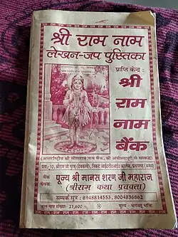 Ramnam Bank (Hindi: रामनाम बैंक), also written as Ram Naam Bank, is a repository institution of Ramnam handwritten booklets. It is a spiritual bank that keeps deposits of Ramnams booklets written by devotees of Lord Rama.[1] It is a unique spiritual institution, primarily found in the Indian subcontinent, where devotees "deposit" booklets filled with the repeated writing of the name of Lord Rama (or sometimes other deities). These Ram Naams are handwritten by devotees.[2][3] It is not monetary bank or financial institutions. It doesn't not involve monetary transactions; instead, the act of writing and depositing the sacred name of Lord Rama is considered a spiritual practice for gaining merit and fostering devotion.[4] It is a bank where faith is the currency and the divine name is the deposit.[5][6][7][8]