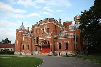 In 1879 Tsar Alexander II gave the estate of Ramon to his niece Princess Eugenia and the Duke of Oldenburg as a wedding gift. In 1883 they commissioned construction of the palace, in red brick, in the style of an English Gothic castle with gatehouse. The architect is usually said to have been Christopher Neysler,[1][2] but some sources attribute the design to Nicholas Benois.[3] The building used "foot bricks" manufactured according to a traditional process involving peasants treading the clay into wood frames for firing.[3]