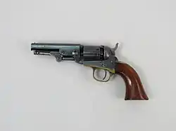 Colt's rammer, patented by Samuel Colt about 1839, is a straight lever hinged under the barrel, with a triangular plate on its back end. The back corner of the triangle is hinged under the barrel, while the bottom corner is hinged to a short ramrod below and behind it. Pulling the lever down pushes the rod into the lowest chamber of the cylinder. This system was used on Colt revolvers from 1839 until 1873, when the Colt Peacemaker with metallic cartridges was introduced, as well as on Remington and Webley revolvers.[3][4]