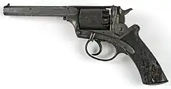 Adams rammer, patented by Robert Adams in 1853, a straight or slightly downward-curving lever mounted on the left or right side of the frame with a screw at the front end and resting under the cylinder on the side of the stock when not in use. The lever pivots around a pin at the front end (on the frame of the revolver in front of and below the cylinder), and has a short ramrod in the middle, facing down in a fixed position. To use, the lever must be manually rotated down and forward for 270°, until the lever is in front of the cylinder and the rod enters one of the chambers, pressing the ball in. This mechanism was used on older Adams revolvers (on the left side of the revolver) and Webley Longspur revolvers (on the right side of the revolver).[5][6]