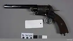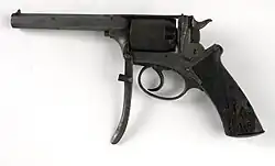 Kerr rammer, patented by James Kerr[7] in 1855,[5] a bent lever (bent downwards at a right or obtuse angle, with a short ramrod on the lower arm) which pivots about a pin on the front of the revolver frame in front of the cylinder and rests on the left side of the barrel when not in use. The lever must be turned up 90° to push the rod into the chamber. This mechanism was used in the Beaumont-Adams and Tranter revolvers, as well as the newer Adams and Webley Longspur revolvers.[8]