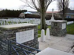 Currently, there are 841 Commonwealth casualties of World War I who are either buried or commemorated in Ramscappelle Road Military Cemetery. Of those, 312 are unidentified. Included in that number are 26 special memorials to those initially interred at Nieuport or Nieuport-Bains, and whose graves were destroyed in battle.[1] In addition to the above, 2 unidentified Foreign National burials are present, for a total of 843 graves in the cemetery. There are 529 identified casualties at Ramscappelle.[9] Among those interred in the cemetery are World War I British flying aces Lieutenant Lionel Ashfield and Captain Harold Mellings.[10][11][12][13]