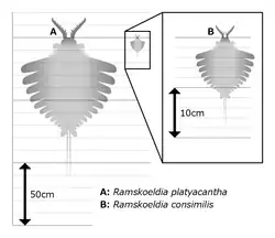 Two species of Ramskoeldia have been described, R. platyacantha and R.? consimilis, but the taxonomic placement of latter species within this genus has been consistently questioned by subsequent studies.[2][3][4] The endites of R. platyacantha are stout and their length does not exceed the height of the podomere to which they attach. The shaft podomeres 2 and 3 of R. platyacantha also bore prominent endites resembling those of distal articulated podomeres. Conversely, in R. consimilis, the endites of the distal articulated region are slender and most of them have a length that exceeds the height of podomere to which they attach. The shaft of R. consimilis has only a simple endite on podomere 3. The frontal appendages of R. consimilis had been previously misidentified as Houcaris saron owing to their similar overall appearance.[1]
