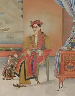 In April 1835, Bhimsen also hatched a plan to make a state visit to Great Britain, hoping to secure recognition of the sovereignty of Nepal; but since he could not make the visit himself, his nephew Colonel Mathabar Singh Thapa was chosen as the representative of Nepal, bearing a few gifts and a letter from King Rajendra addressed to King William IV.[13][14][15] In this process, Ranbir Singh, the governor of Palpa, was made Full General beside the promotion of Mathabar Singh Thapa and Sher Jung Thapa.[15] After the annual muster at the beginning of 1837, an investigation was also started to check Bhimsen's expenditures in establishing various battalions.[16] Such events led the courtiers to feel that Bhimsen's Mukhtiyari would not last very long; thus Ranbir Singh Thapa, in the hopes of becoming the next Mukhtiyar, wrote a letter to the King asking him to be recalled to Kathmandu from Palpa. His wish was granted; and Bhimsen, pleased to see his brother after many years, made Ranbir Singh the acting Mukhtiyar and decided to go to his ancestral home in Borlang Gorkha for the sake of pilgrimage.[1] On 24 July 1837, Rajendra's youngest son, Devendra Bikram Shah, an infant of six months, died suddenly.[17][18] It was at once rumored that the child had died of poison intended for his mother the Senior Queen Samrajya Laxmi Devi: given at the instigation of Bhimsen, or someone of his party.[18][19][20] On this charge, Bhimsen, his brother Ranbir Singh, his nephew Mathbar Singh, their families, the court physicians, Ekdev and Eksurya Upadhyay, and his deputy Bhajuman Baidya, with a few more of the nearest relatives of the Thapas were incarcerated, proclaimed outcasts, and their properties confiscated.[18][19][21][22]