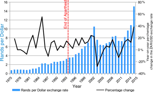 The January drop in value was also partly caused by Japanese retail investors cutting their losses in the currency to look for higher-yield investments elsewhere and due to concerns over the impact of the economic slowdown in China, South Africa's largest export market.[15] By mid-January, economists were speculating that the rand could expect to see further volatility for the rest of 2016.[16][17] By 29 April, it reached its highest performance over the previous five months, exchanging at a rate of R14.16 to the United States dollar.[18]