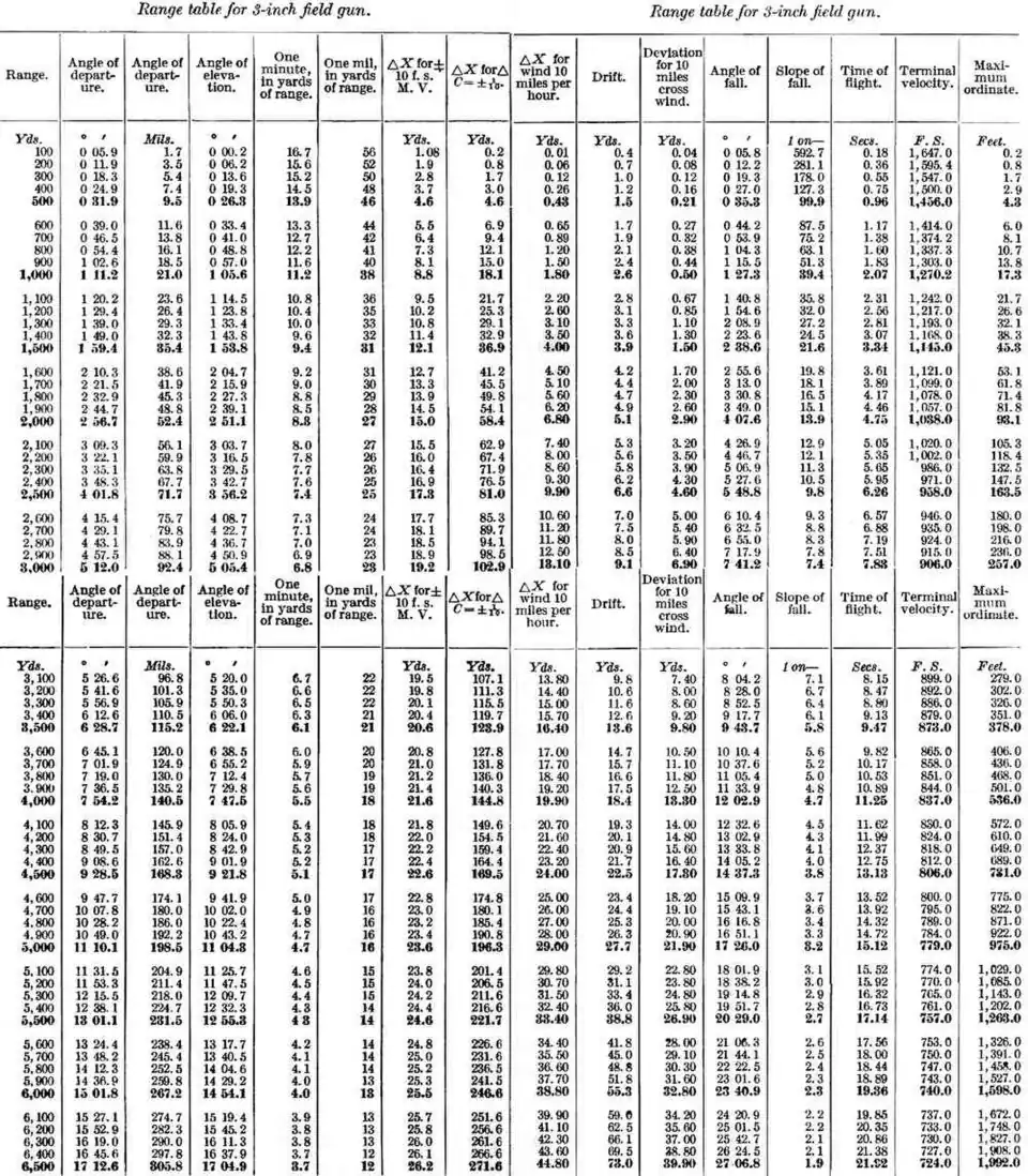Range table for US 3-inch (76.2 mm) field gun, models 1902-1905
