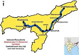 The Rangiya–Dibrugarh Express is an Express train belonging to Northeast Frontier Railway zone that runs between Rangiya Junction and Dibrugarh in India. It is currently being operated with 15967/15968 train numbers on a six days in a weekly basis.[1][2][3]