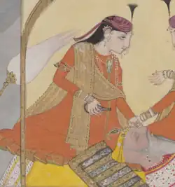 Rani Katochan was the principal mourner at the funeral of Ranjit Singh and emerged from the palace into the large courtyard for the first time in her life unveiled and barefoot, proceeding slowly toward the corpse.[5] According to Sohan Lal Suri's account of Ranjit Singh's funeral, she placed the head of Ranjit Singh in her lap as the pyre burnt them whilst the other three queens and seven concubines performing sati sat in a circle around them.[6] When news of Rani Katochan's sati reached her family back in Kangra, they were very pleased and decided to commission a painting in 1840 depicting the event.[3]