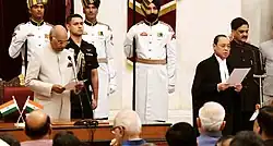 On 3 October 2018, he was sworn in as the Chief Justice of India, succeeding Dipak Misra.[64][65][66] He was administered the oath by President Ram Nath Kovind at the Durbar Hall in Rashtrapati Bhavan.[67][68] Many dignitaries were present at the event, including Narendra Modi, Rajnath Singh, Arun Jaitley, Mallikarjun Kharge, Sumitra Mahajan, Sudip Bandyopadhyay, Derek O’Brien, Manmohan Singh, H. D. Deve Gowda, L. K. Advani, Sushma Swaraj and many other prominent political figures. Gogoi's mother, Shanti Priya Gogoi, also attended the ceremony.[69][70]