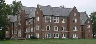 'Rankin Hall, also known as the Administration Building and Chapel of Tarkio College is a historic building located on the campus of the former Tarkio College at Tarkio, Atchison County, Missouri. It was built in 1930–1931, and is a 3+1⁄2-story, T-shaped, Collegiate Gothic style brick and stone building. The building measures 144 feet wide and extends 141 feet deep. It features steep projecting gables with stepped parapets, numerous pointed arch windows, buttresses, and a mix of limestone and cast stone trim. The building served as the Presbyterian college's administration building and chapel.[2]: 5