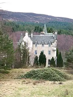 He is buried at a private grave site by the burn adjacent to the house. The building is a romantically styled Scots Baronial mansion house designed by architects Thomas Mackenzie and James Matthews. Prior to being purchased by the school, it was used as offices by the Forestry Commission.