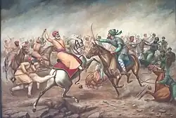 During a Battle near the present day town of Sahwa, while leading the forces of Bikaner Rawat Kandhal faced a strong resistance by the imperial forces of Bahlol Lodi led by Sarang Khan, the governor of Hisar. During the battle his saddle somehow broke and taking advantage of that Sarang Khan encircled him. He valiantly died fighting and even crossed blades with Sarang Khan himself. It is said that 21 corpses of the enemy laid dead around him. The battle resulted in the death of the 73-year-old Rathore chief. His wife, Deevariji committed Sati at Sahawa. Various bards were written about him describing the events of his last Battle and his contributions to the kingdoms of Marwar and Bikaner.[10]