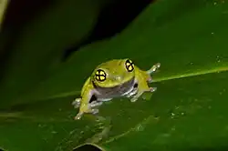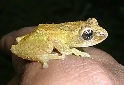 Raorchestes are largely nocturnal, relatively small frogs with adult body size 15–45 mm (0.6–1.8 in) in snout-vent length. They lack vomerine teeth. Males have a large transparent vocal sac while calling. All described species of Raorchestes thus far, show direct development, that is, their life cycle does not involve a free-swimming tadpole stage.[9] Their eggs hatch-out froglets skipping the tadpole stage making them less dependent on water.[9] Raorchestes tinniens eggs took 36 days to hatch and temperature played a huge role in the development times.[10] Different individuals of a species within this genus can be difficult to identify in the field because of color and pattern variations.[6] Species of the genus Raorchestes also have different variations in their iris and pupil coloration.[3] Difficulties in field identifications are leading to more integrative species description practices within the genus.[11] These difficulties have also led to potential misidentification of species and ranges.[12]
