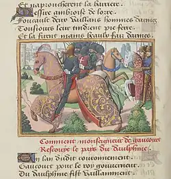 In 1400 Gaucourt was a founding member of Boucicaut's Order of the White Lady on a Green Shield.[2]