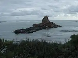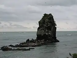 The rock is a prominent landmark for navigators at sea as well as travellers on the road to Sumner. It marks the outflow from the Avon Heathcote Estuary. The rock stands close to the southern shore and is accessible from the beach at low tide. Because of its height and separation from the background cliffs it serves as a natural navigation marker that can be used by navigators to judge a vessel's position at sea, especially when close to shore in the shoaling waters in the vicinity of the Sumner Bar.[11] During the 19th century the estuary outflow flowed much closer inshore, across the beach towards the nearby Cave Rock before sweeping out to sea.[11] When the bar area was surveyed by HMS Pandora in 1854, the sandbar the extended from the Southshore was exposed at half tide seaward of much of Sumner beach and the outflow channel swept the beach area free of sand, forming a small bay where there is now a sizeable beach.[11] The former shoreline is apparent from historic photographs and painting of Sumner beach showing roads at the water's edge, and a jetty into the bay where the beachside tea rooms are now.