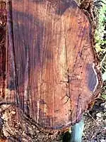 Ceratocystis huliohia: This fungal pathogen was confirmed by plant pathologist Lisa Keith and her lab team in 2014.[13] Keith and her team asked local Hawaiians for advice before choosing the name Ceratocystis huliohia for the fungal organism. "Huliohia" means that it changes the natural state of ʻŌhiʻa).[13] This fungal pathogen has been found to create a canker disease beneath the bark that slowly spreads throughout the water-conducting tissue within the tree, leading to wilting leaves, dried out branches and ultimately, the death of the tree.[13] In both ROD fungal pathogens, signs of the disease have been shown in the outer ring of the cut trunk.[14] Additionally, scientists have found through systematic dissections of the tree that the darkest portion of the bark is where the fungus has entered, and that predominantly the fungus has been found that the disease grows quicker up the stem of the tree than down it.[14] Researchers have also been studying how the excrement created by boring beetles within the ʻŌhiʻa trees can be used as a pathway for both pathogens of ROD.[12]