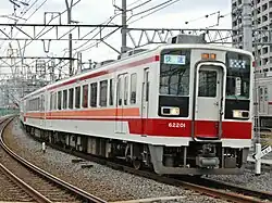 Some private and third-sector railways also offer rapid train services, which, unlike JR Group trains, are sometimes treated as "higher-category trains" alongside other services such as Limited Express, Express, and Semi-Express.[4] However, whether or not fare-free trains are also included in the category of "higher-category trains" differs among railroad companies, and some companies do not treat them as "Higher-category trains" in the same way as the JNR and JR Group. For example, the Rapid Trains and sectional rapid trains that operated on Tobu Isesaki Line and Nikkō Line until April 2017 were operated by the 6050 series, semi-cross-seat cars designed to be used on such trains, but the company does not use the term "Higher-category trains" to describe fare-free trains, even if they are classified as express trains. Keio Electric Railway also operates trains using the 6050 series semicross-seat cars. Keio Electric Railway also refers to trains that do not stop at every station as "Express Series Trains"(急行系列列車, Kyūkō Kēretsu ressha) rather than "Higher-category trains".[5] They are also sometimes operated on subway lines such as the Yokohama Municipal Subway Blue Line, the Tokyo Metro Tozai Line, and the Toei Asakusa and Shinjuku lines.