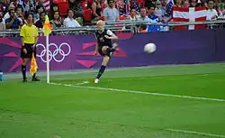 During a dramatic semi-final match against Canada at Old Trafford, Rapinoe scored two game-equalizing goals in the 54th and 70th minutes. Her first goal was scored directly from a corner—a corner kick that goes untouched by another player into the net.[115][116] She is the first and so far only player, male or female, to score an Olimpico at the Olympic Games.[117] The U.S. defeated Canada 4–3 with a stoppage time goal in the 123rd minute by Alex Morgan.[118] With her two goals, Rapinoe is one of only five players, including Wei Haiying, Cristiane, Angela Hucles and Christine Sinclair, to have scored two goals during an Olympic semi-final.[119]