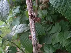 Raspberry spur blight is caused by the fungus Didymella applanata.[2] This plant pathogen is more problematic on red raspberries (Rubus idaeus) than on black or purple raspberries. The fungus infects the leaves first and then spreads to the cane. It causes necrotic spots on the cane near the base of the petiole attachment.[3] Raspberry spur blight can cause a significant reduction in yield, fruit blight, premature leaf drop, and weak bud and cane growth. The magnitude of damage is not clearly understood in the United States, however, studies from Scotland suggest damage to the cane itself is limited.[4] The disease has minor economic impacts by reducing leaves in the summer or killing buds. Major economic damage occurs if the disease manages to kill the entire cane.[3] In the United States, this disease is found in Oregon and Washington.[5]