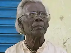 Ratan Kahar (born 1935) is a veteran folk singer of Bhadu and Jhumur songs of rural Bengal in India. The Government of India awarded the Padma Shri, the country's fourth highest civilian award, in 2024.[2] His famous song Boroloker Biti Lo gained popularity in 1972 with Swapna Chakraborty's voice.[3] The original line of this song Lal Genda Phul caused controversy[4] when popular rap artist Badshah released his "Genda Phul" in 2020. Due to that controversy, Ratan Kahar's music creation, achievements, songs, artistry came to the fore. Badshah settled the dispute by giving him five lakh rupees.[5]