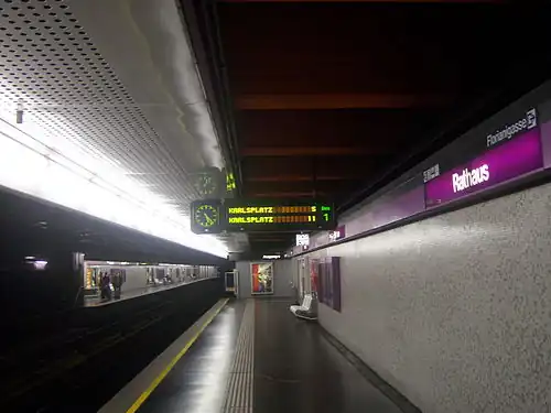 Rathaus is a station on U2 of the Vienna U-Bahn.[1] It is located in the Innere Stadt District. It opened in 1980. It is on the border between the 1st and 8th districts of Vienna. It is located directly under Landesgerichtsstraße between Josefstädter Straße and Friedrich-Schmidt-Platz and has two side platforms and exits on both sides of Landesgerichtsstraße. At the Josefstädter Straße exit, it is possible to change to tram line 2 in the direction of Dornbach or Friedrich-Engels-Platz. Barrier-free access by elevator is currently only possible via the Friedrich-Schmidt-Platz exit.