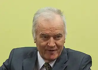 Ratko Mladić (Serbian Cyrillic: Ратко Младић, pronounced [râtko mlǎːdit͡ɕ]; born 12 March 1942) is a Bosnian Serb former military officer who led the Army of Republika Srpska (VRS) during the Yugoslav Wars.[1][2][3] In 2017, he was found guilty of committing war crimes, crimes against humanity, and genocide by the International Criminal Tribunal for the former Yugoslavia (ICTY). He is serving a life sentence for these crimes in The Hague.