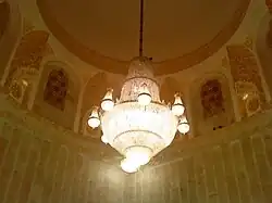 - A glittering crystal chandelier, suspended from the center of the dome, sheds its brilliance upon the tomb and seems to cast a divine light upon the hallowed precincts, while the four circular corner fittings and twenty four wall brackets lend their light to the radiance within the Mausoleum. The chandeliers are especially made on order and each pendetive is engraved with the Quranic verse "لا يمسه الا المطهرون" (Surah 56 Ayah 79) meaning "none but the pure shall hold the Holy Quran".