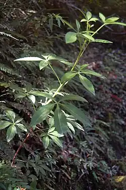 It is an evergreen tree or shrub with ash-coloured bark, measuring up to 6 m (20 ft) in height. The leaves are composite, alternate, the petioles are 2–8 cm long, thickened at the base, the leaves are digitate, with uneven leaflets, light green glossy in color, leathery, oblong-lanceolate, attenuate at both ends, toothed edges 3-8 long and 1-1,6 wide, the flowers are hermaphrodite, pedicellate, clustered in 2-5 in inflorescences with many racemes, the flowers are formed by a floral tube 1.5 mm long, the calyx is split in 5 tepals and 5 thick whitish-green ovate-lanceolate sepals, with a mucro 2 mm at the acute apex, 5 stamens with whitish anthers, loculate inferous ovary 3-5, 4-5 styles, the fruit is a brown spherical drupe 5-5.5 mm in diameter, crowned by two styles.