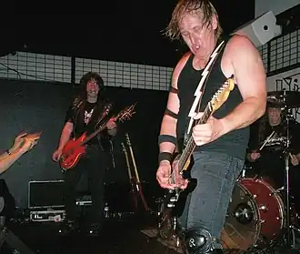 Raven are an English heavy metal band, formed in 1974 by the Gallagher brothers, bassist and vocalist John and guitarist Mark.[1] They have released fifteen studio albums to date, and had a hit with the single "On and On". Often referred to as "athletic rock", the band gained notoriety as part of the early-to-mid 1980s new wave of British heavy metal (NWOBHM) scene[1][2][3][4] and is considered to be an influence and inspiration on the development of the thrash metal genre, including "the big four" (Metallica, Slayer, Megadeth and Anthrax),[5][6][7] as well as other bands such as Testament, Exodus, Overkill, Kreator, Destruction, Sodom, Onslaught, Death Angel, Flotsam and Jetsam, Coroner, Annihilator, and Razor.[7][8][9][10] Raven are also notable for headlining Metallica's first-ever national tour in 1983.[6][11][12]