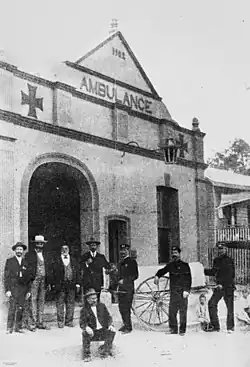 In the 1890s, the perceived need to provide trained assistance and transport to hospital for the sick and injured resulted in the formation in Brisbane of the Queensland Ambulance Transport Brigade. Charters Towers set up the second branch of the QATB in 1900, needing it not only as a major city, but also as a mining town. Mining had always been a dangerous occupation and rapid growth tended to overtake the provision of safety measures, making serious accidents not uncommon. This was also the case in Ravenswood where between 1879 and 1917, 22 miners were killed and 116 injured in the course of their work. The water supply was also unsafe and there were periodic outbreaks of serious illnesses caused by this. The ambulance centre was established in Macrossan Street, a date commemorated on the parapet of the current ambulance building. Ambulances were equipped with harnesses which were used to pull up injured men from mine shafts. In 1904, the current building was constructed to serve 4700 people, the highest population level that Ravenswood would ever have.[1]